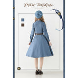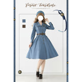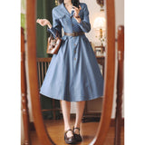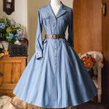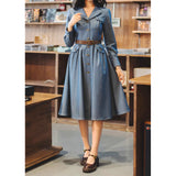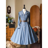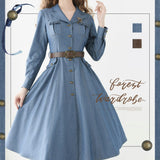 ヴィンテージライクで上品な佇まいを感じさせる、レトロなデニムワンピース。テーラードカラーとフロントに並ぶメタル調のボタンが印象的。胸元のポケットには細かなフリルが施されており、さりげない可愛らしさを添えています。ウエストにはブラウンベルトが配され、シルエットを引き締めながら女性らしいラインを強調しています。スカート部分はふんわりと広がるフレアシルエットで、動きに合わせて優雅な表情を生み出します。