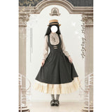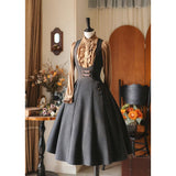 クラシカルな香りを纏った上品なジャンパースカート。すっきりとした深めのネックラインと、身体の線に沿って美しく絞られた身頃が印象的。ウエストからたっぷりと広がるフレアシルエットは動くたびにやわらかなラインを描き、端正に配された小さな金属釦や控えめなポケットのディテールが全体に静かなリズムを与えます。背面のレースアップがさりげなく奥行きを与え、可憐さの中に凛とした佇まいと落ち着いた品格を感じさせます。