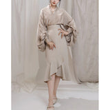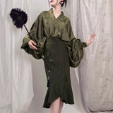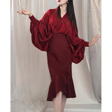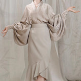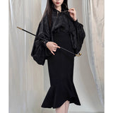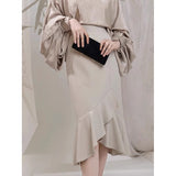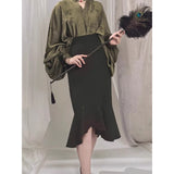 モダンチャイナの要素を取り入れたマーメイドスカート。ウエスト部分は着物の帯を思わせる高めの切り替えで、身体のラインを美しく引き立てつつ、裾にかけて流れるように広がるフレアが優雅な印象を与えています。歩くたびに揺れるアシンメトリーなフリルが、東洋的な品格と現代的な洗練さを醸し出しています。