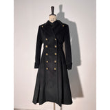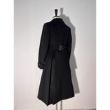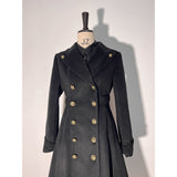 深みのある黒を基調にしたクラシカルなロングコート。前面に並ぶゴールドのダブルボタンが荘厳な存在感を放ち、まるで19世紀のヨーロッパ軍服や貴族の外套を思わせる仕立てとなっています。後ろ姿には装飾的なバックル付きベルトが配され、シルエットに立体感と気品を与えています。シンプルながらも重厚なデザイン。威厳と優雅さを併せ持ったコート。