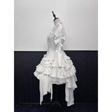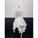 ゴシックな静謐さと劇的な動きを同時に宿したヴィクトリアンブラウスとティアードスカート。ブラウスは、立ち上がるフリルネックから縦に連なる装飾と、幾重にも重なるプリンセススリーブが印象的。バックの編み上げが身体の線を彫刻のように際立たせます。スカートは不規則に重なり合うフリルと段差のある裾が歩みに合わせて優雅に揺れます。