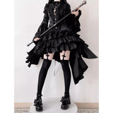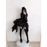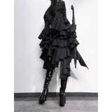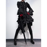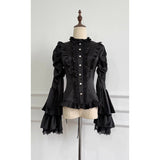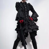 ゴシックな静謐さと劇的な動きを同時に宿したヴィクトリアンブラウスとティアードスカート。ブラウスは、立ち上がるフリルネックから縦に連なる装飾と、幾重にも重なるプリンセススリーブが印象的。バックの編み上げが身体の線を彫刻のように際立たせます。スカートは不規則に重なり合うフリルと段差のある裾が歩みに合わせて優雅に揺れます。