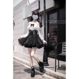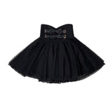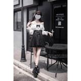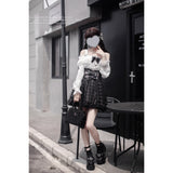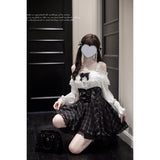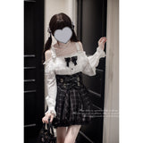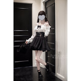 フェミニンさとダークな雰囲気を併せ持ったトップスとスカート。トップスはオフショルダーで、胸元と袖口には繊細なフリルがあしらわれ、黒いリボンと装飾がアクセントになっている甘めのデザイン。肩部分のクロスストラップがフェミニンで華奢な印象を強調しています。ハイウエストのブラックフレアスカートは、大きなリボンベルトのデザインが目を引き、シルエットにメリハリを加えています。裾はふんわりと広がり、レースで縁取られていて華やか。クラシカルでガーリーな雰囲気の中に、可憐さを感じさせるデザインに仕上げています。
