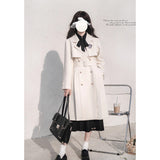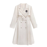 アイボリーカラーのトレンチが映える、気品あるクラシカルなアイテム。上品さが際立つダブルブレストのトレンチコートは、クラシカルでありながら動きのあるデザイン。ウエストベルトでシルエットを美しく引き締めています。ブラウスは胸元に花の刺繍が施されており、首元のリボンがクラシカルなアクセントとなり、全体のモノトーンスタイルにエレガントな印象を添えています。プリーツスカートは、シンプルながらも端正なデザインです。