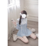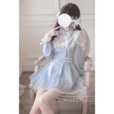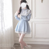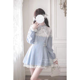 ヨーロッパのクラシカルドレスを思わせる優雅さと、ドールのような可憐さを融合させたワンピース。繊細なレースのヨークと大ぶりのリボンが胸元を飾り、可憐で気品ある雰囲気を演出しています。ウエスト部分には小さなハート型のバックル付きベルトが二重にあしらわれ、シルエットをきゅっと引き締めながら愛らしさを添えています。スカートは軽やかに広がるフレアで、裾にはレースのトリミングが施され、ふんわりとした透明感が漂います。