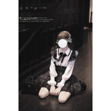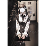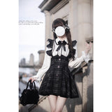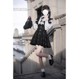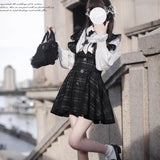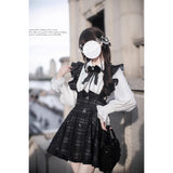 マットな黒のチェック柄を基調とし、シックな配色と肩紐のフリルが織りなす退廃的な可愛さが魅力のジャンパースカートとブラウス。ジャンパースカートは立体感あるタック入りで、優雅な広がりがあります。ブラウスはパフスリーブで袖口にはレースが施され、少女らしさを演出しています。落ち着きと少女らしさを絶妙に両立させたアイテム。