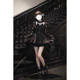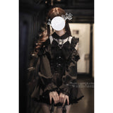 可愛さと妖艶さを同居させたゴシックロリータ調のワンピース。肩のスリットから素肌を覗かせるデザインと、胸元にあしらわれた大きなリボンが特徴的で、レースやフリルが繊細に重なり合いながらも全体にシルエットはコンパクトでモード感を漂わせています。ウエスト部分には編み上げリボンと煌めくビジューが施され、ドーリーさとエレガンスを融合させています。