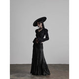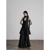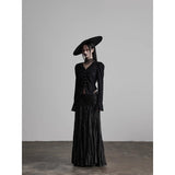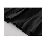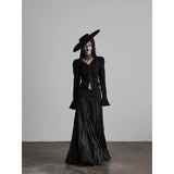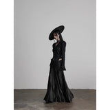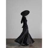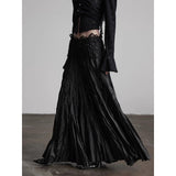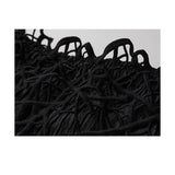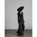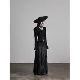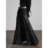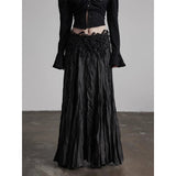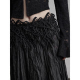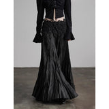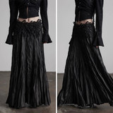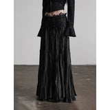 ウエスト部分に立体的なコード編みが施されたロングスカート。裾にかけて広がるフレアシルエットと、細かいシワ加工の入ったテクスチャが特徴的。動くたびに揺れる独特の陰影を生み出しています。編み込み装飾とシワ加工の組み合わせにより、重厚感と繊細さが共存する、アーティスティックでエッジの効いたアイテム。