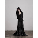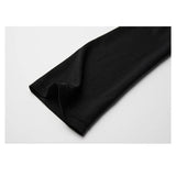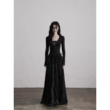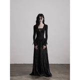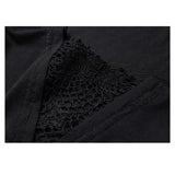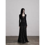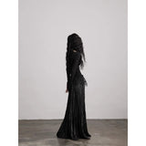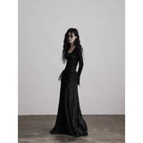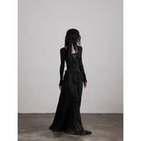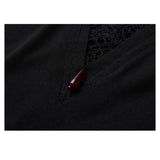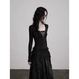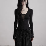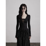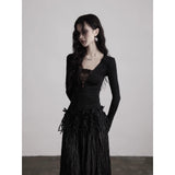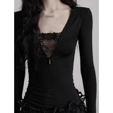 深いVネックに繊細なメッシュレースをあしらった、ボディラインにフィットするブラックのロングスリーブトップス。胸元には小さなドロップ型のチャームがアクセントとして配置され、エレガントでありながらダークで妖艶な雰囲気を漂わせています。