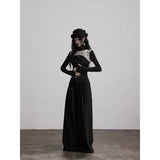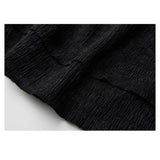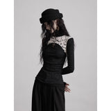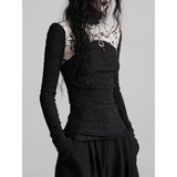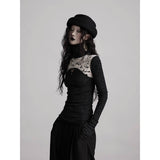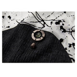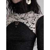 アートとモードが交錯するような構築的なデザインが印象的なハイネックトップス。上部には絵画の筆跡を思わせるモノトーンのスプラッター柄が施され、キャンバスのように白地に黒の軌跡が広がります。ボディ部分はシャーリングの効いたブラックファブリックで、身体にしなやかに寄り添いながらも彫刻的なフォルムを描きます。静謐なクラシシズムを漂わせ、全体に“静かに燃える芸術作品”のような存在感を与えています。