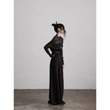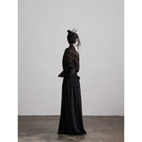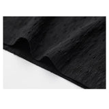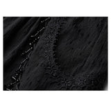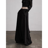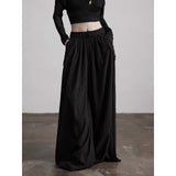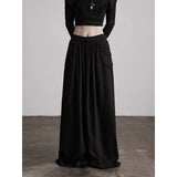 静寂の中に潜む華やかさを纏うようなブラックのワイドパンツ。重厚なドレープが床を滑るように流れ、立ち姿に絵画的な陰影を生み出します。ウエストやポケット部分にはビーズ刺繍の装飾が施され、黒の中に密やかな輝きを宿す。光を吸い込むような深い質感と、繊細な装飾のコントラストが美しい、夜の静謐を思わせる一着。