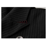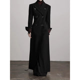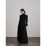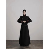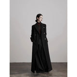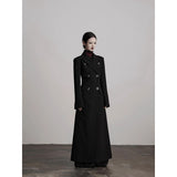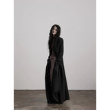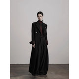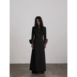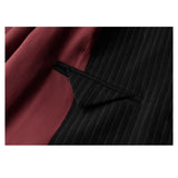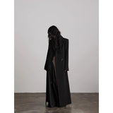 威厳と静謐を併せ持つロングテーラードコート。繊細なピンストライプが闇の中に微光のように走り、端正なシルエットが無言の強さを語ります。内側に潜む深紅の裏地が、静かな激情を秘めたように覗く。クラシックなダブルボタンと長いフォルムが、まるで貴族の影を現代に蘇らせたかのような一着。