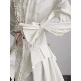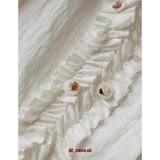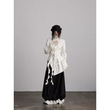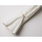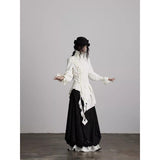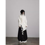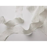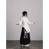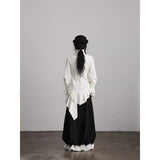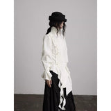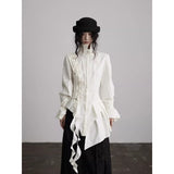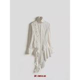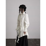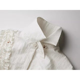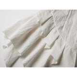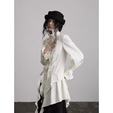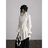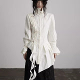 高く立ち上がる襟元が首筋を静かに縁取り、白一色の生地に刻まれた細やかな皺と陰影が、時間を経た紙や布のような奥行きを感じさせるブラウス。前身頃には片側に寄せられた立体的なフリルとギャザーが流れるように配され、左右非対称の構成が静謐さの中にわずかな緊張感を宿しています。全体としては禁欲的でありながら詩的な余韻を残しており、彫刻のような存在感を放っています。