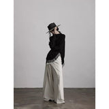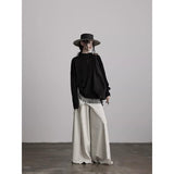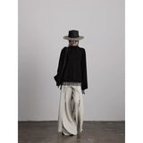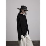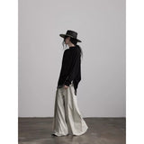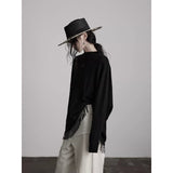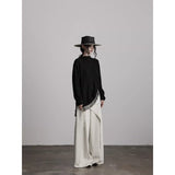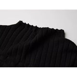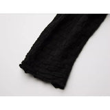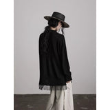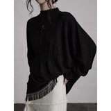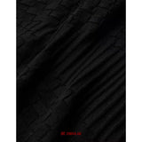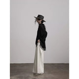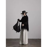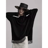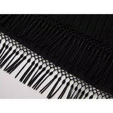 厳しさと儚さ、静謐さと自由さが同居した、夜の空気をまとったようなニットトップス。黒一色でまとめられたトップスは、光をほとんど反射しない深い色味の中に、繊細な縦の凹凸とわずかな透け感を宿し、布そのものが呼吸しているかのような存在感を放っています。袖から裾にかけては軽やかな揺れが生まれ、裾端には細やかなフリンジが連なり、動くたびに黒の輪郭をやわらかくほどいていきます。