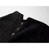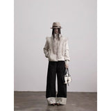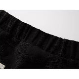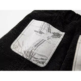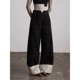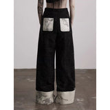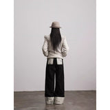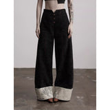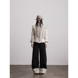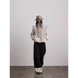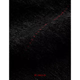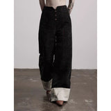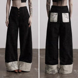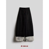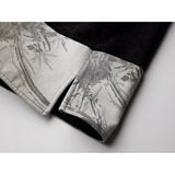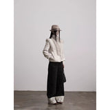 折り返された裾部分とバックのポケット部分に水墨画が描かれたワイドパンツ。深い墨色を思わせる重みのある生地で仕立てられ、腰まわりは静かに身体に沿いながらも裾に向かってゆったりと落ちるワイドシルエット。フロントには控えめにボタン配置されており、足元で折り返された生成り色の別布がまるで物語の余白のように現れます。