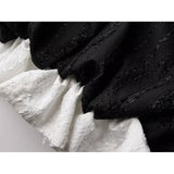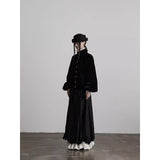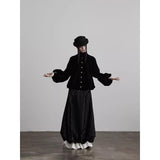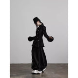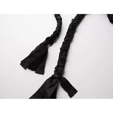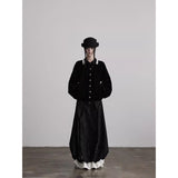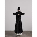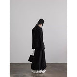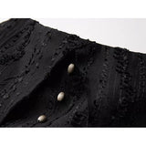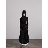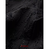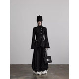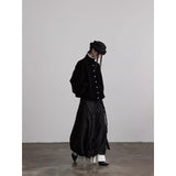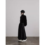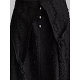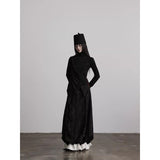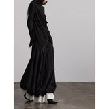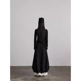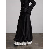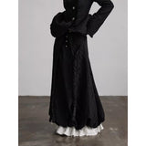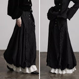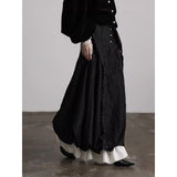黒を基調に、布そのものが静かに呼吸しているようなロングスカート。縦に流れるような織りや刺繍が陰影を生み、歩くたびに表情がわずかに揺らぎます。ウエストから裾へと落ちるラインは重さを感じさせながらも硬さはなく、裾には白い別布が覗くように重ねられ、黒の深さの中にかすかな対比と余韻を残しています。構築的でありながらどこか崩れた詩情をまとい、静寂と緊張感を併せ持つ一着として存在しています。