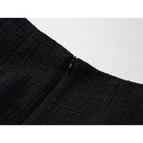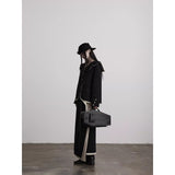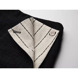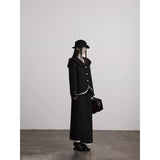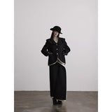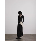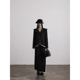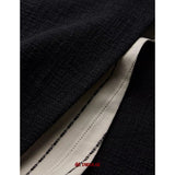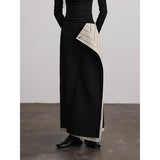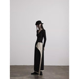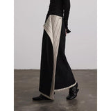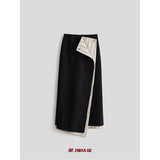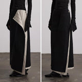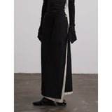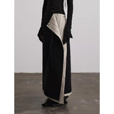 黒を基調とした直線的な佇まいの中に、片側だけ差し込まれた生成りの切り替え布が静かな緊張感を生むロングスカート。重さのあるブラックの生地が身体に沿って落ちる一方、ストライプの入った淡色のパネルがめくれるように現れ、歩みのたびに構造と非対称の美しさを浮かび上がらせます。腰から裾へと続く縦のラインは彫刻的で、装飾を抑えた中に素材の表情と配色のコントラストが際立ち、理知的でありながらどこか前衛的な余韻を残す一着。