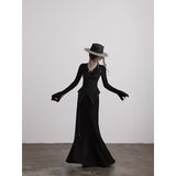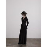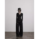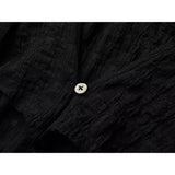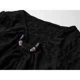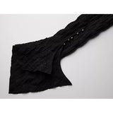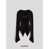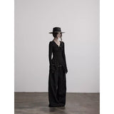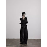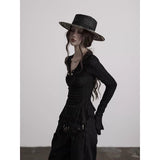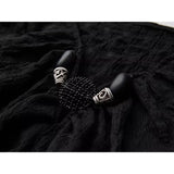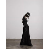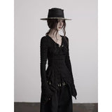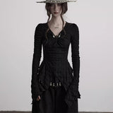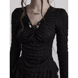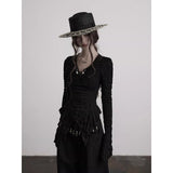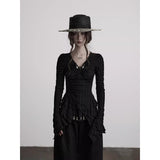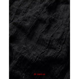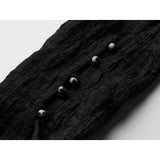 身体に沿って静かに寄り添うようなスリムトップス。繊細なシワ感を持つ黒の生地が全体に緊張感のある表情を与え、長い袖は手首を越えて落ちることで影の余韻を引き伸ばし、胸元には控えめに集められたギャザーと装飾がわずかな光を宿しています。裾は不規則に揺れるレイヤーで終わることで、端正さの中に崩れた詩情と内省的な美しさを湛えています。