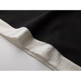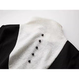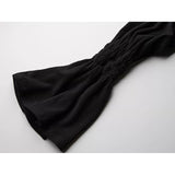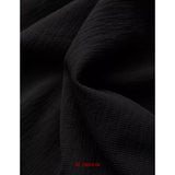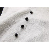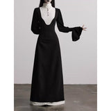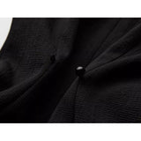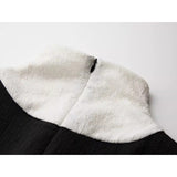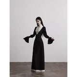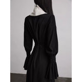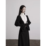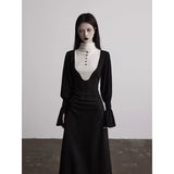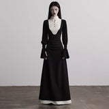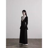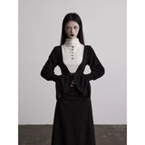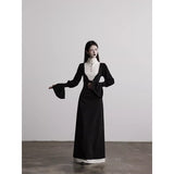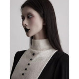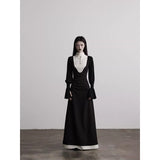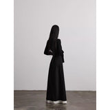 白と黒の対比、直線と曲線の緊張感が共存し、静かな威厳と幻想性を纏った、時代や場所を限定しない孤高のワンピース。静謐な黒を基調に、身体の線に沿って落ちるロングシルエットが印象的。胸元には白の異素材パネルが配され、ハイネックから縦に並ぶ小さなボタンが、まるで古い儀式衣装のような厳粛さを添えています。ウエストはすっきりと絞られ、そこから裾へと静かに広がるラインが縦の流れを強調し、動くたびに布がわずかに揺れて余韻を残します。袖は手首に向かって緩やかに広がるベルスリーブで、背面には控えめなギャザーが施され、後ろ姿にも密やかな立体感を宿しています。