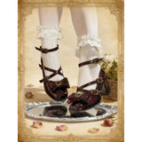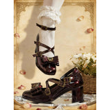 クラシカルでロマンティックな世界観のストラップヒールパンプス。足首から甲にかけて幾重にも交差する細いベルトと、アンティーク調の小さなバックルが連なり、可憐でありながらも、上品な印象を与えます。つま先には端正に結ばれたリボンが静かな甘さを醸し出しています。