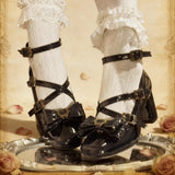 クラシカルでロマンティックな世界観のストラップヒールパンプス。足首から甲にかけて幾重にも交差する細いベルトと、アンティーク調の小さなバックルが連なり、可憐でありながらも、上品な印象を与えます。つま先には端正に結ばれたリボンが静かな甘さを醸し出しています。