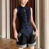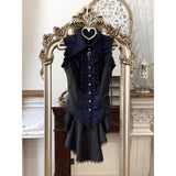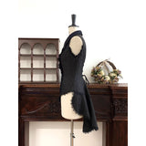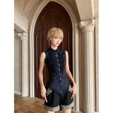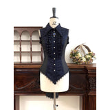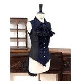 古城の舞踏会に現れる若き貴族、あるいはゴシック小説に登場する気高い令嬢を思わせるノースリーブブラウス。胸元を縦に走るフリルが重なり、まるで中世の礼装のような厳かな気配を漂わせています。ウエストを美しく絞るコルセットライクな切り替えと背面のレースアップが、どこか退廃的でドラマティックなシルエットを形成しています。貴族の夜会、そして少し危うげなロマンを織り交ぜた世界観をイメージして制作された、気品と妖艶さが共存するデザイン。