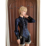 古城の舞踏会に現れる若き貴族、あるいはゴシック小説に登場する気高い令嬢を思わせるブラウス。胸元を縦に走るフリルが重なり、まるで中世の礼装のような厳かな気配を漂わせています。ウエストを美しく絞るコルセットライクな切り替えと背面のレースアップが、どこか退廃的でドラマティックなシルエットを形成しています。貴族の夜会、そして少し危うげなロマンを織り交ぜた世界観をイメージして制作された、気品と妖艶さが共存するデザイン。