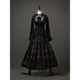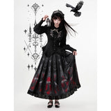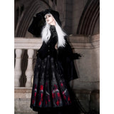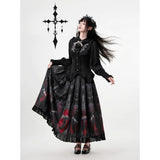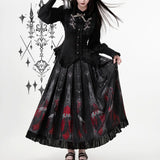 宗教画のような荘厳さと、退廃的な幻想世界を纏うような存在感を持つゴシックスカート。荘厳なステンドグラスや大聖堂の尖塔を思わせるモチーフの中に、堕天使の姿が描かれています。裾にはフリルがあしらわれ、動きに合わせて揺れるエレガントなシルエット。ダークで退廃的な美しさを演出しています。