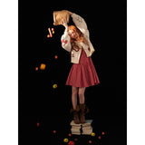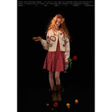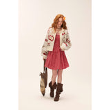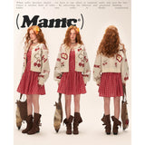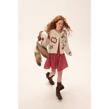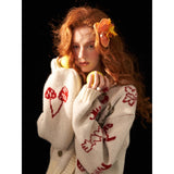 林檎やさくらんぼ、咲き誇る花々を散りばめたキュートで遊び心のあるニットカーディガン。胸元の林檎は糸で紡がれており、丸みのあるシルエットとボリュームのある袖がガーリーで温かみのある雰囲気を演出しています。