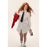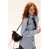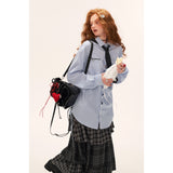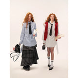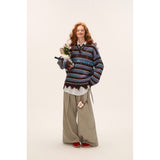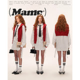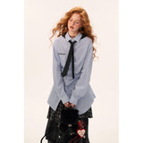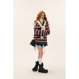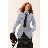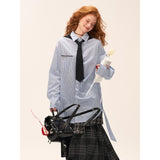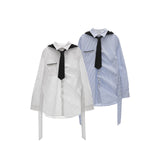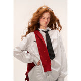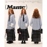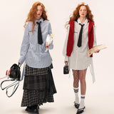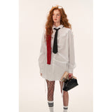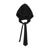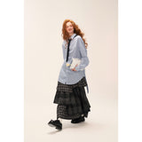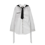 モード感とカジュアルさが同居した独創的なスタイル。ロング丈のストライプ柄オーバーサイズシャツに合わせているのは、チェック柄のフード付きネクタイ。シャツはゆったりとしたシルエットが特徴的で、バックでリボンを結べるようになっています。遊び心のあるフード付きネクタイを組み合わせることで、首元にユニークな存在感を与えています。