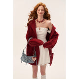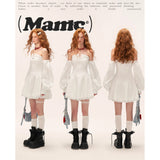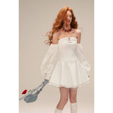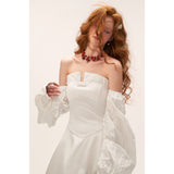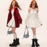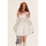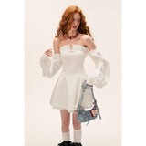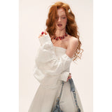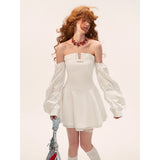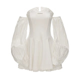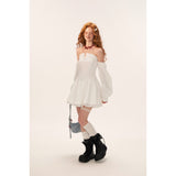 ホワイトを基調にしたオフショルダーワンピース。胸元に切り込みを入れたスクエアラインが特徴的。バスト部分から広がるフレアシルエットが女性らしい優美さを演出しています。特に目を引くのは、ボリューム感のある長い袖で、プリーツやギャザーが施され、ロマンティックで優雅な印象を与えます。ボリューム感のあるバルーンスリーブがドラマティックな存在感を放ち、クラシカルでありながらモダンな雰囲気を融合させたアイテム。