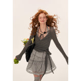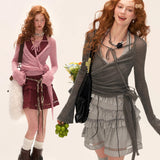 空気のように軽やかで、包み込むような繊細さを纏ったニットトップス。柔らかな透け感と華奢なリボンが生み出すフェミニンなラインは、まるで詩的な余韻を残すよう。胸元からウエストにかけてのラップデザインが女性らしい曲線を描き、結び方次第で印象を自在に変化させます。ピンクは甘く儚い夢の色、グレーは知的で静かな艶を宿しています。