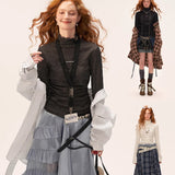 繊細なプリーツと柔らかく波打つテクスチャが特徴的なハイネックなスリムトップス。身体に寄り添うフィット感と、ほのかな陰影がエレガントな印象を与えます。長めのスリーブやメロウな裾が動くたびに揺れ、静かな女性らしさを漂わせます。ブラックとグレーは知的でモードに、ホワイトは儚くピュアに。一枚でもレイヤードでも着こなしが完成します。