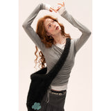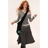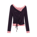 繊細なレースとアシンメトリーなドレープが織りなすフェミニン×アヴァンギャルドなトップス。胸元からウエストにかけて斜めに走るギャザーが身体のラインを柔らかく包み、裾のリボンが軽やかなニュアンスを添えます。レースのインナーが覗くようなレイヤード風デザインが印象的で、少女の儚さと大人の気配を同時に纏って。