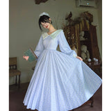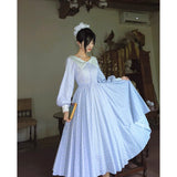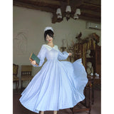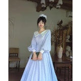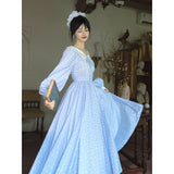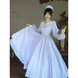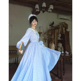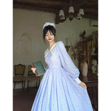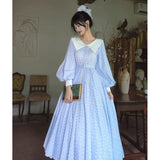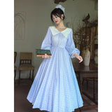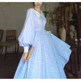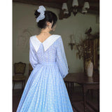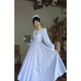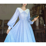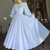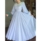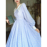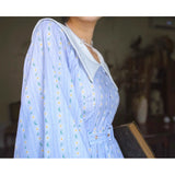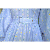 勿忘草の花のような可憐な淡いブルー地に小花柄をあしらったレトロなワンピース。花々をモチーフにしたエンボス加工の襟が清楚でクラシカルな印象を与え、ウエストの共布ベルトがシルエットを引き締めています。ふんわりと広がるフレアスカートとボリュームのある袖が、可憐でどこかノスタルジックな雰囲気を漂わせます。