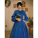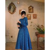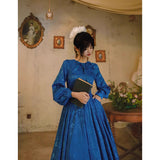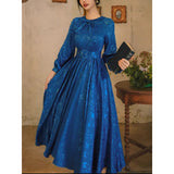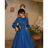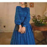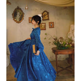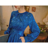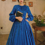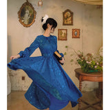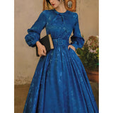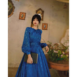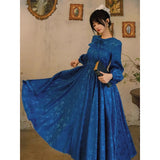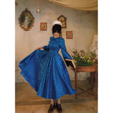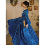 彼方の銀河のような美しい“青”。深みのあるブルーの生地で仕立てられた、1950年代を想起させるレトロなワンピース。生地全体に織り込まれた花や蝶を思わせる繊細な模様が、角度によってさりげなく浮かび上がり、幻想的な輝きを放ちます。ウエストの共布ベルトがシルエットを美しく引き締めながら、スカート部分にたっぷりと広がるドレープを生み出しています。まるで宮廷の舞踏会や物語の一場面に登場するヒロインのような雰囲気を漂わせます。