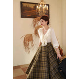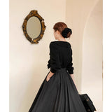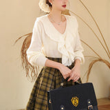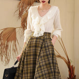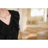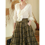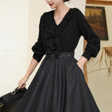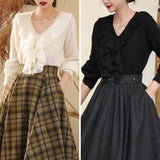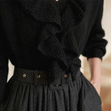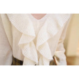 ロマンティックな優雅さと品の良さを兼ね備えたニットセーター。柔らかな質感のニットが身体を優しく包み、フロントにあしらわれた大きめのフリルが華やかさを添えています。Vネックのラインはデコルテを美しく見せ、顔まわりを明るく演出。ふんわりとした袖のシルエットがクラシカルな雰囲気を漂わせつつ、日常にも溶け込む軽やかさを感じさせます。清楚でありながら甘すぎない、大人のフェミニンスタイルにふさわしいニットセーター。