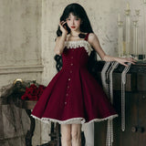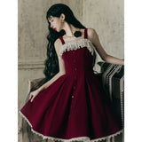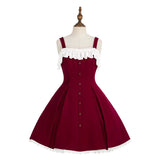 ヴィンテージドールを思わせる愛らしさと、クラシックな気品を併せ持つジャンパースカート。深みのあるワインレッドが基調のクラシカルなデザインで、肩紐付きのシンプルなシルエットながら、胸元にあしらわれたホワイトフリルが華やかなアクセントになっています。前立てには小さなボタンが連なり、可憐さと端正さを両立。裾には白いレースがあしらわれ、上品でロマンティックな雰囲気を演出しています。