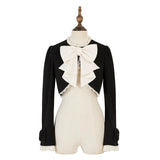 優雅で知的なお嬢様に。ジャンパースカートは、胸元にフリルをあしらい、前ボタンが並ぶクラシカルなデザイン。裾には白いレースが施され、上品な広がりを見せるシルエット。ジャケットは、胸元に存在感のあるリボンが施されており、ベルスリーブとショート丈のデザインが可憐かつエレガントな印象を与えてくれる。