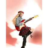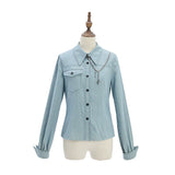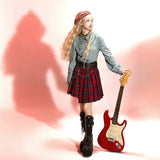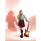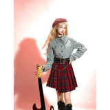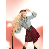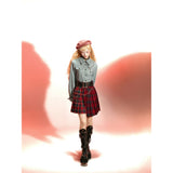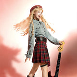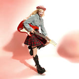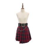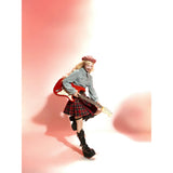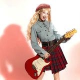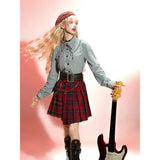 ブリティッシュパンクとロックテイストを融合させたチェック柄のスカートとブラウス。タータンチェック柄のプリーツスカートは、短めの丈で、ロックでカレッジ風な雰囲気を演出。太めのスタッズ付きブラックベルトとチェーンでエッジを効かせています。ライトグレーのブラウスは、胸元にフラップ付きポケットが付いており、チェーンアクセサリーが飾られ、ややミリタリーテイストを感じさせるデザインとなっています。