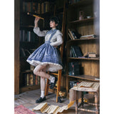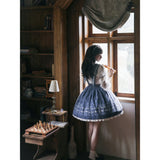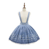 星空の下で物語を紡ぐような、夢見る少女のためのストラップスカートとブラウス。ストラップスカートは星座が描かれ、星々のモチーフが散りばめられています。スカート部分はふんわりと広がり、ホワイトのペチコートが裾からのぞき、清楚さを引き立てています。ブラウスは、クラシックなセーラーカラーをベースに、銀色の刺繍で星座や銀河を表現しています。クラシカルな雰囲気と幻想的な世界観を併せ持ったアイテム。