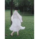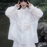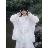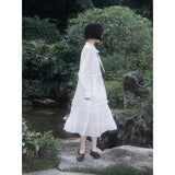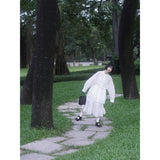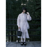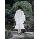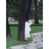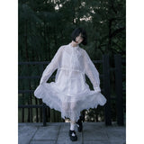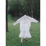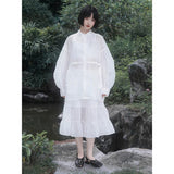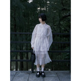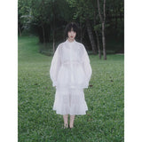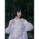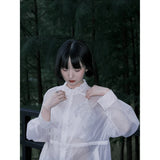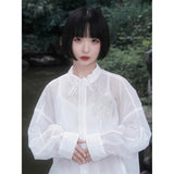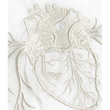 繊細な透け感を持つティンダルナイロンで仕立てられた、胸元に解剖学的な心臓の刺繍が施されたホワイトブラウス。幻想的でアート性を感じさせるデザインに仕上げられています。ゆったりとしたシルエットにふんわり広がるボリュームスリーブが特徴で、首元には小さなリボンタイとフリルのあしらいがあり、可憐でクラシカルな雰囲気を演出しています。全体的に軽やかで儚げな印象を与える、ロマンティックなアイテム。