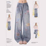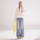ストリートカジュアルにガーリーなエッセンスをミックスした存在感のあるデニムパンツ。カラフルな星々が散りばめられた遊び心あふれるデザイン。施された星々は、レッドやイエロー、パステルカラー、チェック柄を組み合わせた立体的なデザイン。ポップでドリーミーなムードを強調しています。ハイウエストのすっきりとした腰まわりから裾に向かって大胆に広がるボリュームシルエットが、足元にたぷっとたまるルーズな抜け感を演出しています。