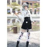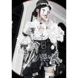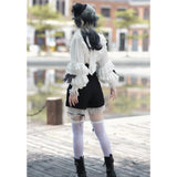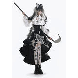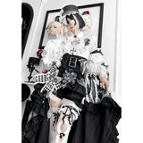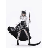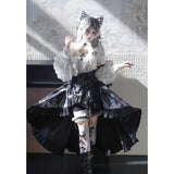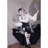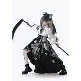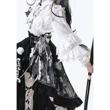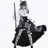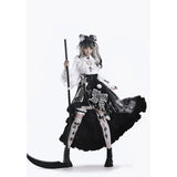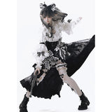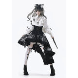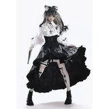 漆黒のリボンに刃を隠した反逆の天使。可愛さの裏に、覚悟や強さを忍ばせた、ファンタジー世界の戦士やダークヒロインを思わせるアイテム。ホワイトのブラウスには、たっぷりのフリルやレースが施されており、ダークブラックのオーバースカートとショートパンツとのコントラストは、善悪、光と影、無垢と毒気といった二面性を象徴しています。かわいらしさと同時に反骨精神や儚さを漂わせてみて。
