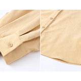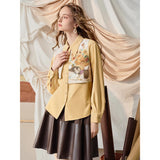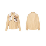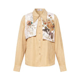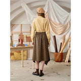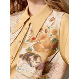 ゴッホが描いた『向日葵』にオマージュを捧げるドッキングブラウス。柔らかなマスタードイエローのブラウスに、絵画生地を胸元に切り替えてあしらったデザイン。プリント部分には向日葵の絵画や『テオへの手紙』、さらに小さな子猫のモチーフが描かれ、物語性のある世界観を演出しています。クラシカルなシャツ襟とフロントのボタンがきちんと感を保ちながらも、絵画的な装飾が加わることで、アートとファッションが融合したようなユニークさを放っています。
