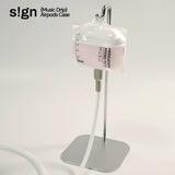 点滴スタンドをモチーフにしたユニークなデザインのスタンド。透明なアクリル板や点滴バッグのAirPods Caseを吊り下げられる仕様になっており、まるで医療用の点滴器具を連想させるような遊び心あるデザインです。シルバーのベースとフックがシンプルかつ無機質な雰囲気を演出し、インテリアや雑貨としても映える存在感を持っています。