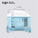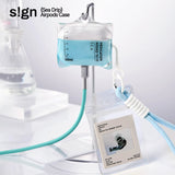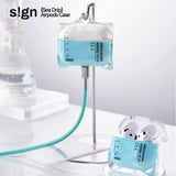 点滴バッグをモチーフにしたAirPodsケース。透明感のあるパックに淡いブルーの液体が入ったように見える仕上がりで、正面には「MEDICATION ADDED TO I.V. / SEA」と医療処方を思わせるプリントが施されています。まるで海水を点滴のように注ぎ込むというユニークなコンセプトを表現しています。医療的なクールさと遊び心を掛け合わせた、インパクトのあるクリエイティブなAirPodsケース。