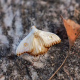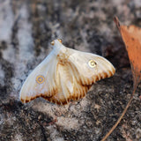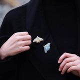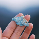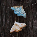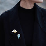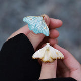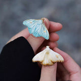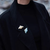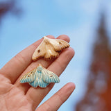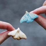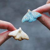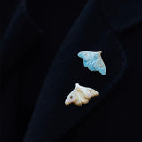 淡い空色と黄みがかった白色の翅を広げた二羽の蛾をモチーフにした陶器のブローチ。翅を少し開いた状態で、特製の釉薬を施すことで、幻想的な雰囲気に仕上がっています。触角や胴体、翅には金色のアクセントを添え、繊細なデザインに仕上げました。