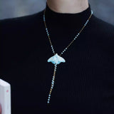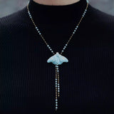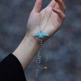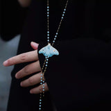 淡い空色の翅を広げた蛾をモチーフにした陶器のネックレス。翅を少し開いた状態で、特製の釉薬を施すことで、幻想的な雰囲気に仕上がっています。触角や胴体、翅には金色のアクセントを添え、繊細なデザインに仕上げました。