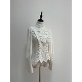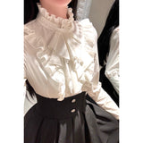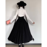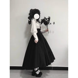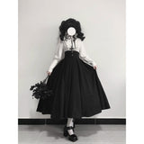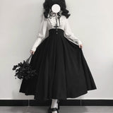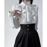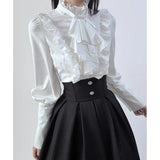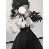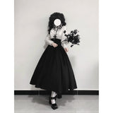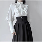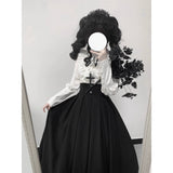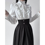 白と黒のコントラストでまとめられた、清廉さと静かな退廃美が共存するような独特の雰囲気を放つお洋服。ホワイトのフリルハイネックブラウスは、胸元に重ねられた柔らかなラッフルが光を受けて立体的に揺れ、袖口に向かってふんわりと広がるクラシカルなシルエットが気品ある佇まいをつくり出しています。そこに合わせられたハイウエストのコルセットスカートは、しっかりとした生地が大きな円を描くように広がり、歩くたびに重厚で美しいドレープを落としながら、クラシカルゴシックの世界観をひときわ強く引き立てています。